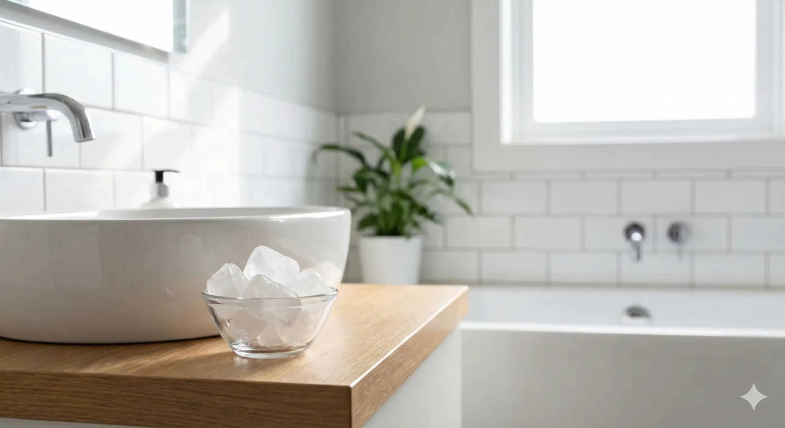 - फायदा: फिटकरी में एक अद्भुत गुण होता है—यह अपने आसपास की सारी नकारात्मक ऊर्जा को अवशोषित (absorb) कर लेती है। जब आप इसे बाथरूम में रखते हैं, तो यह वहां की ऊर्जा को शुद्ध करती है, जिससे घर का माहौल पॉजिटिव बनता है।